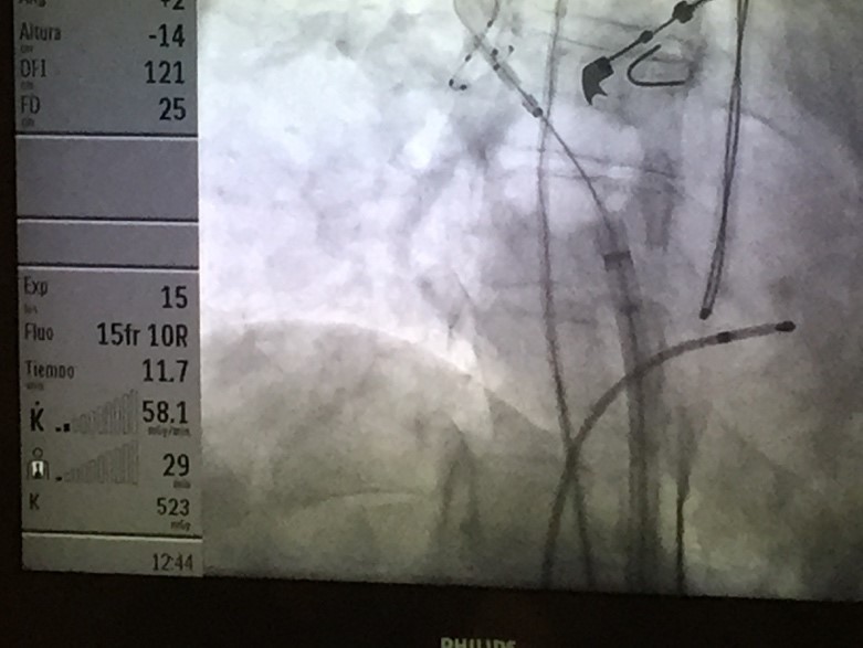 Figura 5: Imagen radiocópica de un caso en donde se observa el balón inflado en la Vena Pulmonar Superior Derecha inciando la aplicación luego de la eyección de contraste sin signos de fuga. Notese además el termometro midiendo la temperatura intraesofágica.