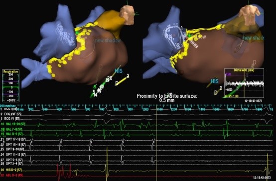 Figura II: a la izquierda esquema de ablación punto por punto alrededor de las venas pulmonares. A la derecha sistema de mapeo no radioscópico con lesiones en amarillo alrededor de las Venas pulmonares derechas observándose en el registro endocavitario en blanco el aislamiento.