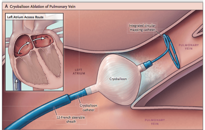 Crioablación con catéter balón. Es una tecnología que utiliza un catéter balón, el cual va plegado sobre un vaina, ingresando desinflado a la AI donde allí se insufla para ser colocado en la boca de cada vena pulmonar (en su desembocadura a la AI) luego de lo cual, cuando el contacto es adecuado se procede a enfriar en su interior mediante un gas que congela al balón y al tejido circundante produciendo una lesión por frío.